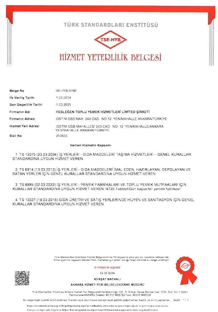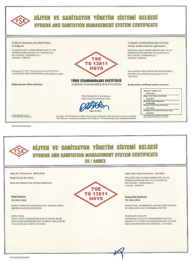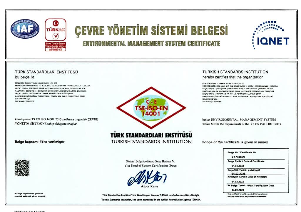 - TSE Hizmet Yeterlilik belgesi kapsamında; TS 13075, TS 8985, TS 6914, TS 13027, TS 9433 standartları,