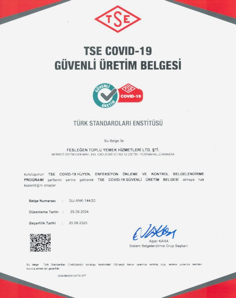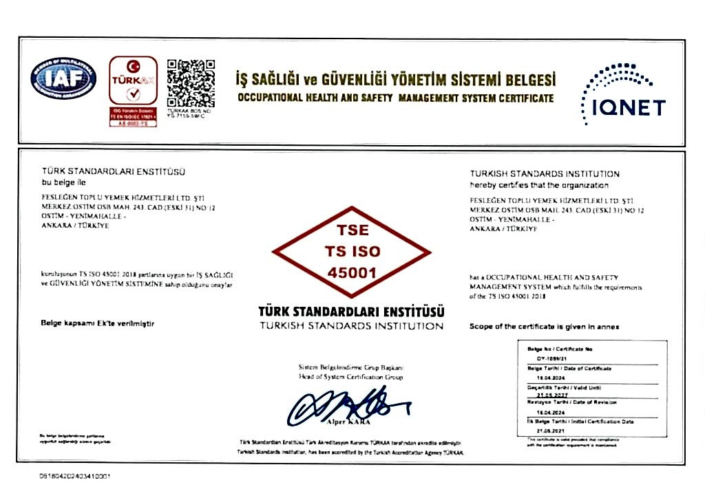 Fesleğen Toplu Yemek Hizmetleri olarak; faaliyet gösterdiğimiz tüm alanlarda müşteri memnuniyetini, gıda güvenliğini, kaliteyi, çevreyi, çalışan sağlığını, sürdürülebilirliği ve iş güvenliğini esas alan entegre bir yönetim anlayışını benimsemekteyiz.